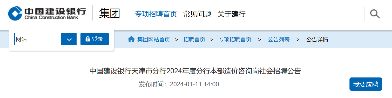 2024年度中國建設銀行天津市分行本部造價咨詢崗社會招聘公告已發(fā)布,報名截止時間為2024年1月28日24點(北京時間)。現(xiàn)將招聘公告原文發(fā)布如下: