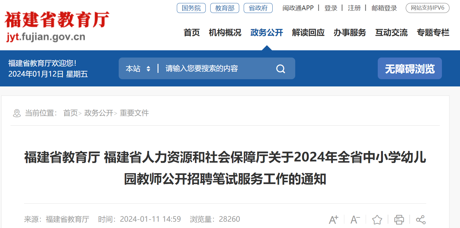 2024年福建省中小學(xué)幼兒園教師公開招聘筆試服務(wù)工作通知已發(fā)布,報(bào)名時(shí)間:3月8日8:00至3月14日17:30,現(xiàn)將原文發(fā)布如下: