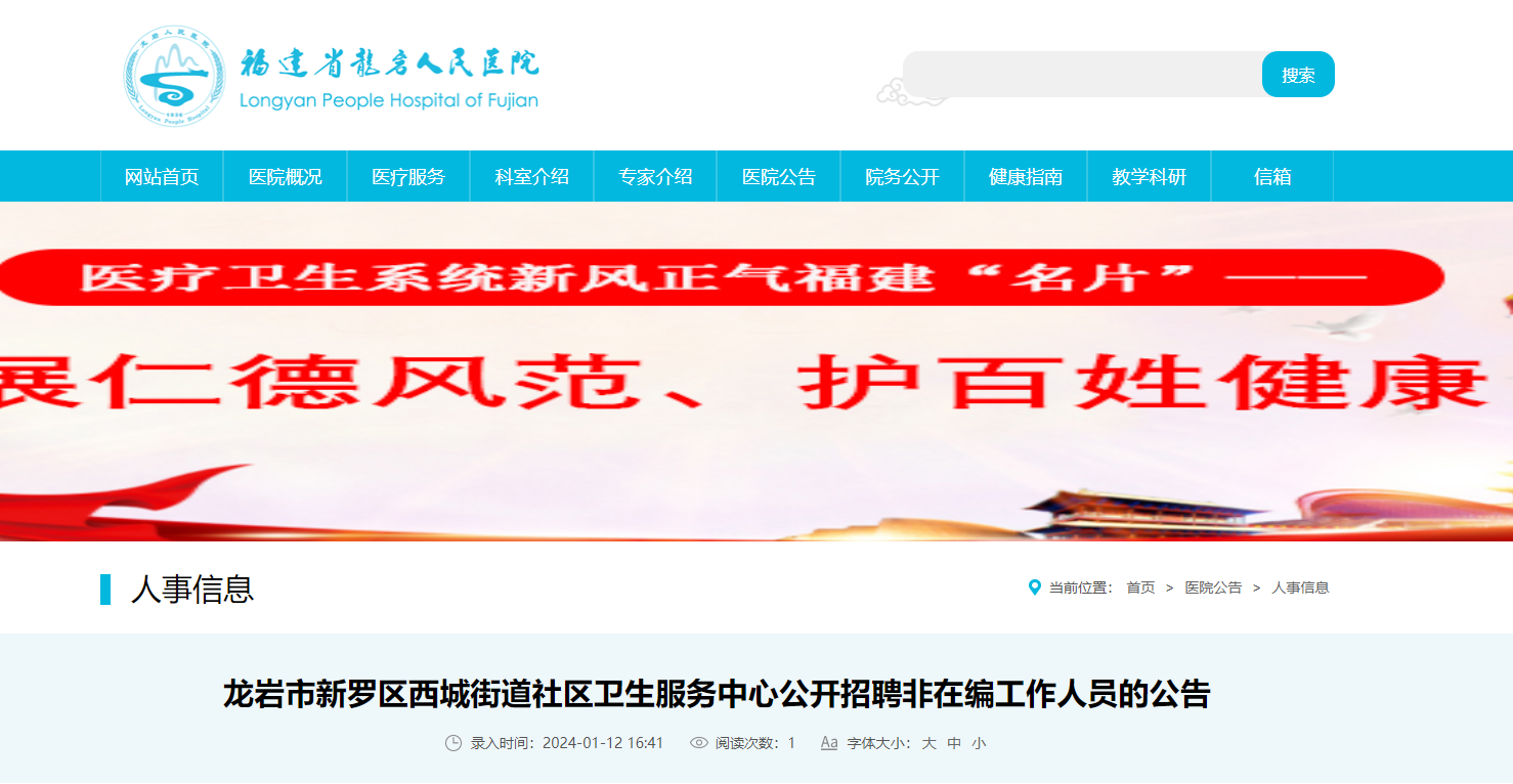 2024福建龍巖新羅區(qū)西城街道社區(qū)衛(wèi)生服務中心公開招聘非在編工作人員2人,報名時間:2024年1月15日至1月19日(正常上班時間:上午8:00-12:00;下午2:30-5:30)。現(xiàn)將招聘公告原文發(fā)布如下:
