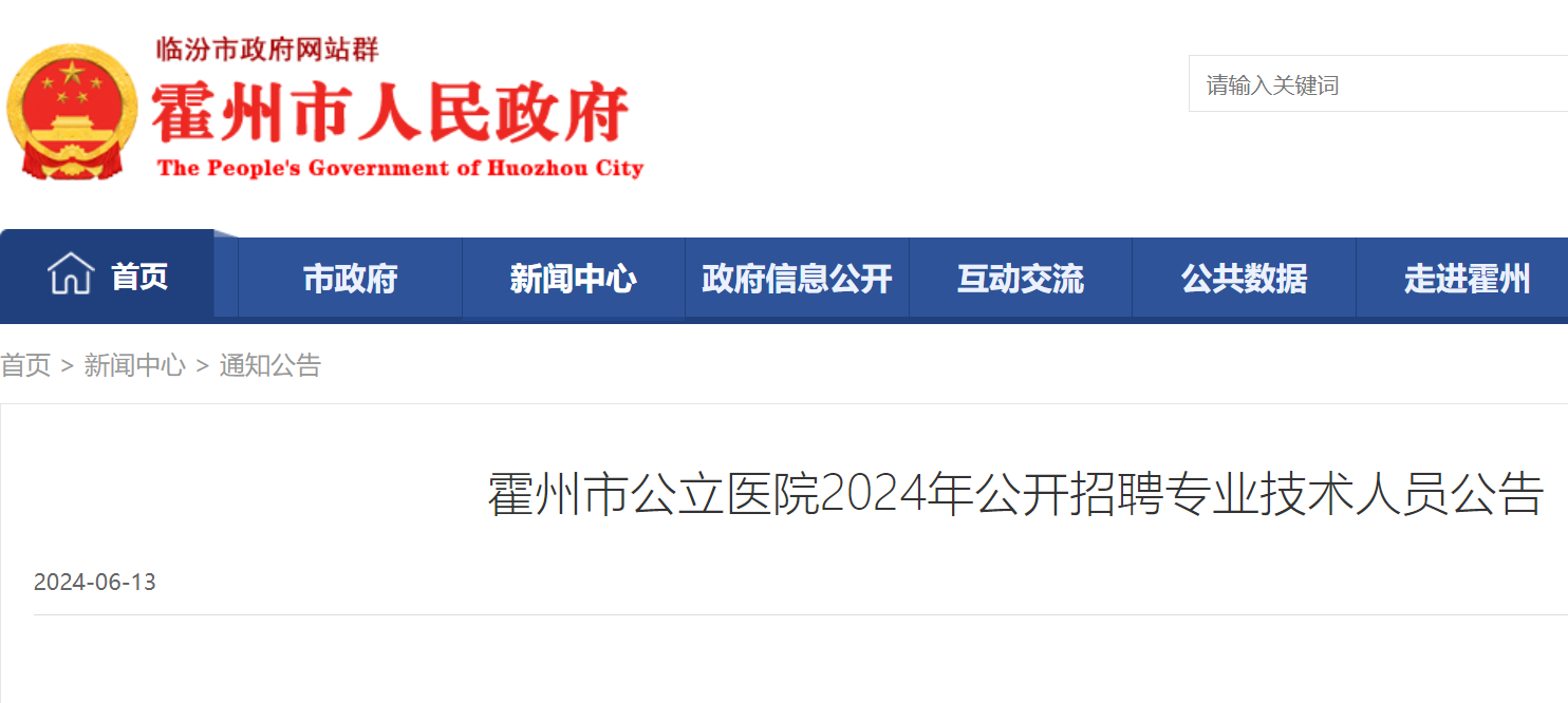 2024年山西臨汾霍州市公立醫(yī)院公開(kāi)招聘專業(yè)技術(shù)人員公告已發(fā)布,報(bào)名時(shí)間:2024年6月24日9:00-2024年6月28日18:00。現(xiàn)將招聘公告原文發(fā)布如下: