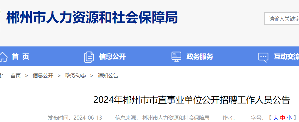 小編根據(jù)郴州市人力資源和社會保障局發(fā)布“2024年郴州市市直事業(yè)單位公開招聘工作人員公告”得知,2024湖南郴州市市直事業(yè)單位招聘工作人員62人,報(bào)名時間為2024年6月19日-6月21日。
