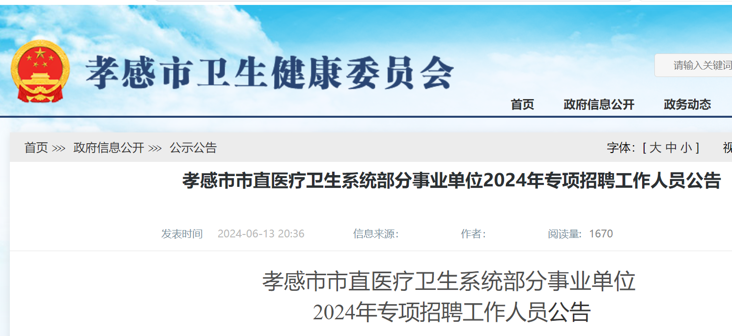 2024年湖北孝感市市直醫(yī)療衛(wèi)生系統(tǒng)部分事業(yè)單位專項招聘工作人員公告已發(fā)布,報名時間:2024年6月17日9:00至6月20日17:00。現(xiàn)將招聘公告原文發(fā)布如下: