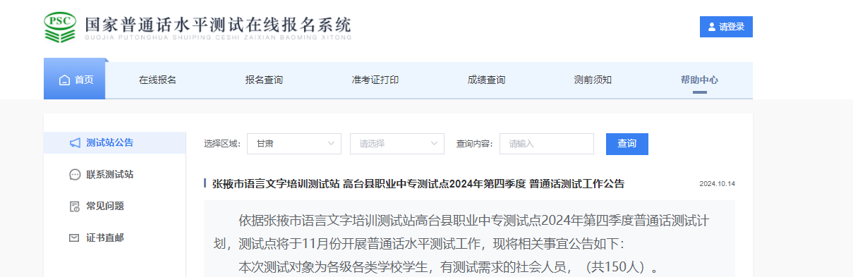 從國家普通話水平測試在線報名系統(tǒng)獲悉,2024年第四季度甘肅張掖高臺縣職業(yè)中專普通話報名時間為10月16日起,考試時間為11月9日-10日,具體詳情如下: