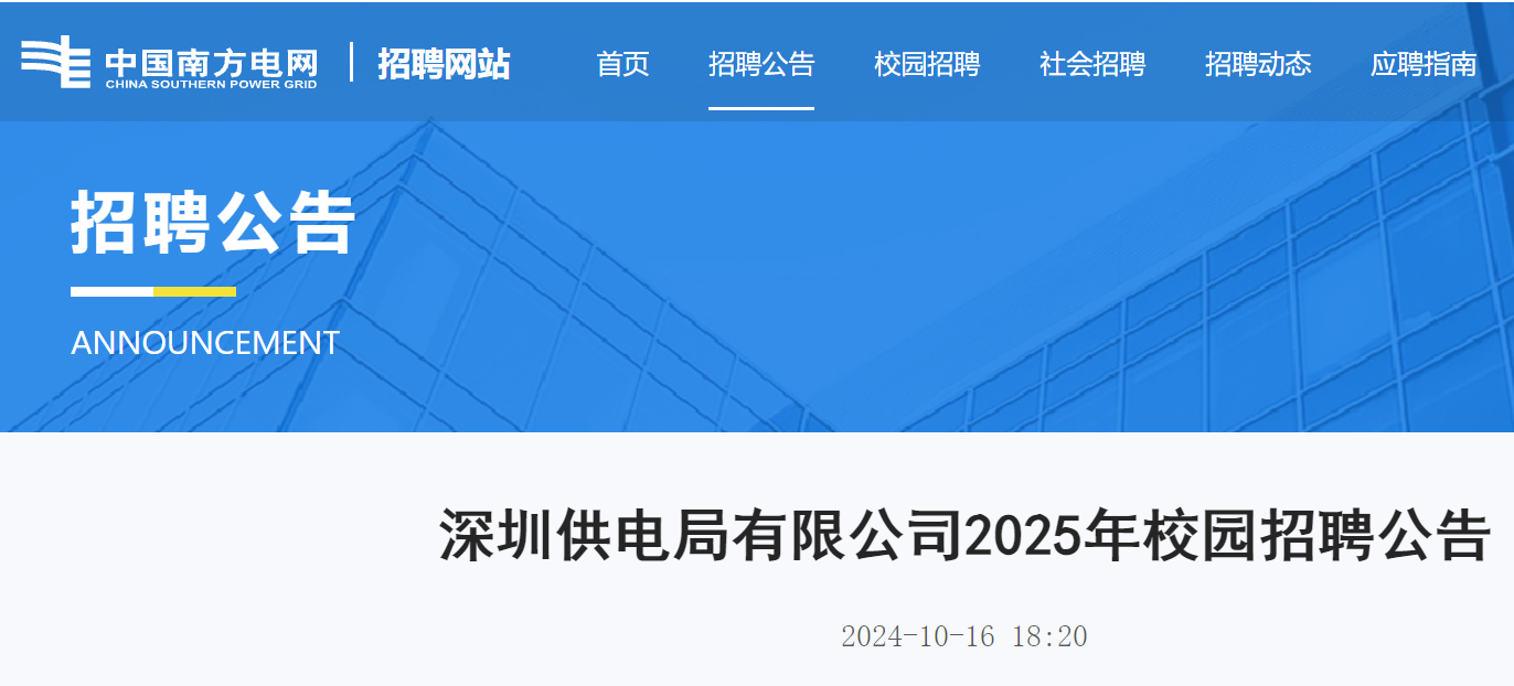 2025年廣東深圳供電局有限公司校園招聘公告已發(fā)布,簡歷投遞時間:即日起至2024年10月31日24:00?,F(xiàn)將招聘公告原文發(fā)布如下: