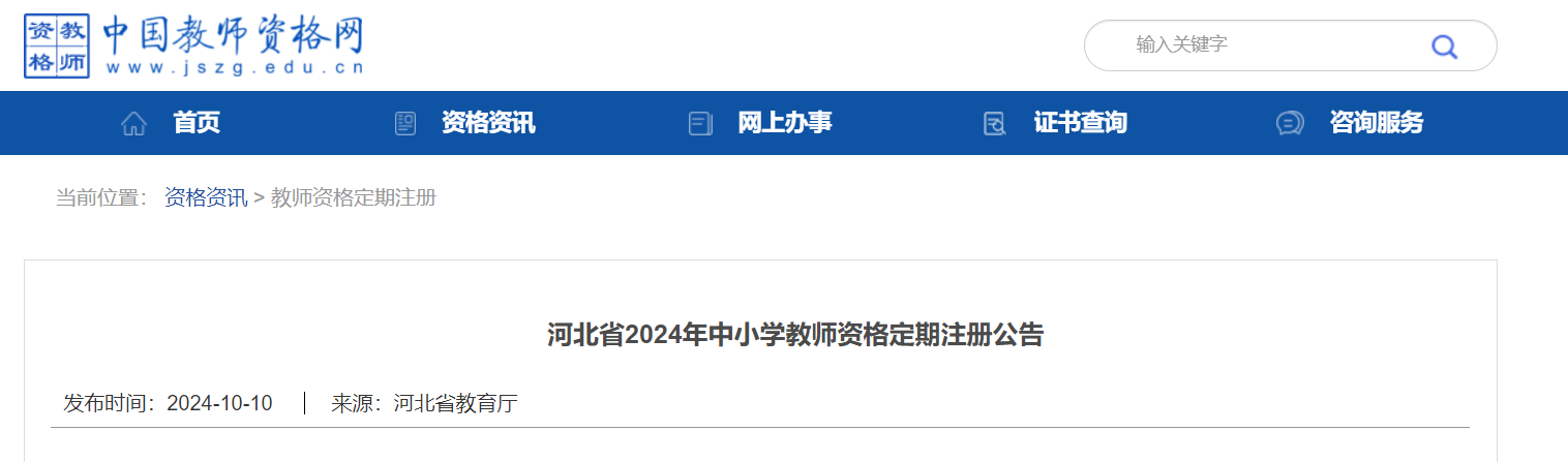 從中國(guó)教師資格網(wǎng)獲悉,2024年河北中小學(xué)教師資格定期注冊(cè)公告已公布,個(gè)人申報(bào)時(shí)間為10月18日至11月20日,具體詳情如下: