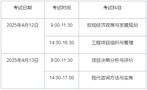 根據(jù)北京市人力資源和社會(huì)保障局發(fā)布的《2025年北京咨詢工程師(投資)職業(yè)資格考試考務(wù)工作通知》獲悉,2025年北京咨詢工程師考試時(shí)間定于2025年4月12日-13日舉行,咨詢工程師考試實(shí)行全國(guó)統(tǒng)一大綱、統(tǒng)一命題、統(tǒng)一組織的辦法,具體時(shí)間、科目安排如下: