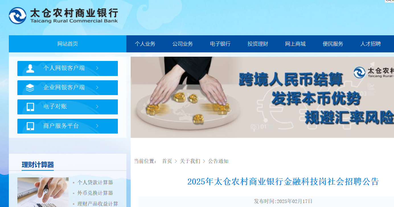 2025年江蘇蘇州太倉農(nóng)村商業(yè)銀行金融科技崗社會招聘公告已發(fā)布,現(xiàn)將招聘公告原文發(fā)布如下: