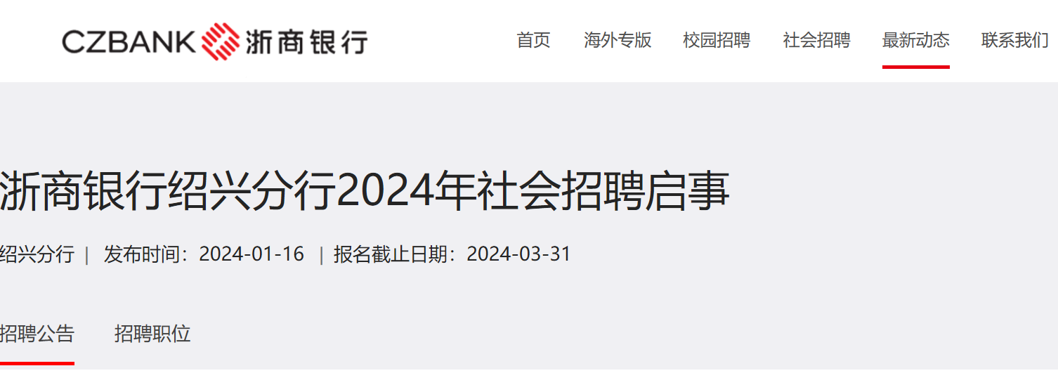 2024年浙商銀行浙江紹興分行社會招聘啟事已發(fā)布,簡歷接收截止日期:2024年3月31日?,F(xiàn)將招聘公告原文發(fā)布如下: