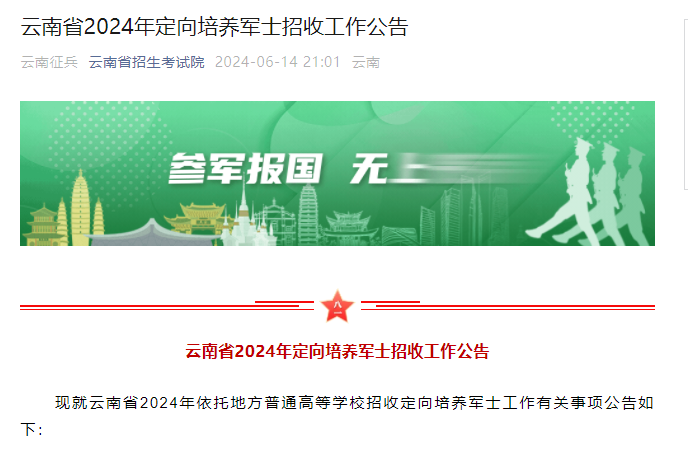現(xiàn)就云南省2024年依托地方普通高等學(xué)校招收定向培養(yǎng)軍士工作有關(guān)事項(xiàng)公告如下: