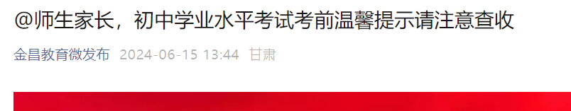 小編根據(jù)金昌教育微發(fā)布“初中學(xué)業(yè)水平考試考前溫馨提示請注意查收”得知,2024年甘肅金昌中考時間為6月16日-18日,考試注意事項(xiàng)如下: