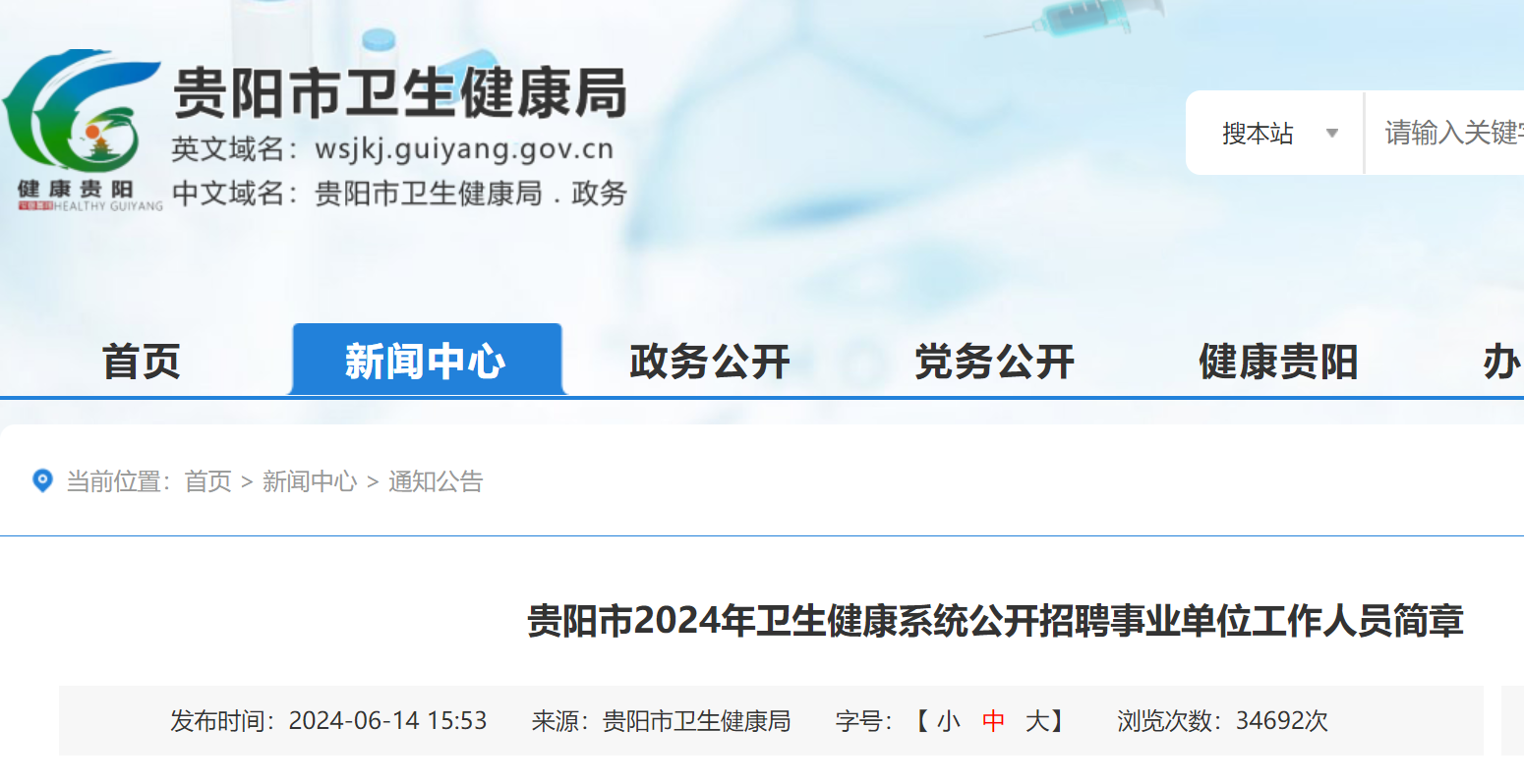 2024貴州貴陽市衛(wèi)生健康系統(tǒng)招聘事業(yè)單位工作人員簡(jiǎn)章已發(fā)布,報(bào)名時(shí)間:2024年6月24日09:00至6月26日17:00?,F(xiàn)將招聘公告原文發(fā)布如下: