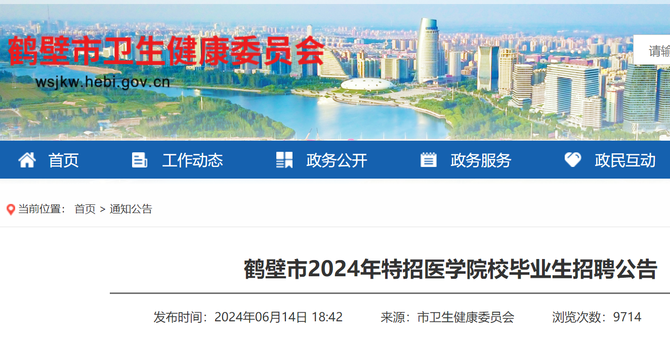 2024年6月14日,在鶴壁市衛(wèi)生健康委員會(huì)網(wǎng)站發(fā)布《鶴壁市2024年特招醫(yī)學(xué)院校畢業(yè)生招聘公告》。