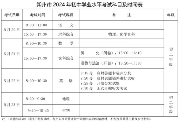 從朔州發(fā)布了解到,2024年山西朔州市初中學業(yè)水平考試科目及時間:6月20日至23日,相關事宜詳情如下: