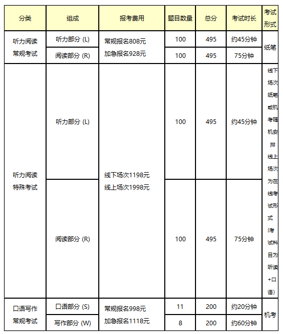 2024年11月托業(yè)聽力閱讀考試費用:常規(guī)考試常規(guī)報名808元,加急報名928元。特殊考試線下場次1198元,線上場次1998元 。