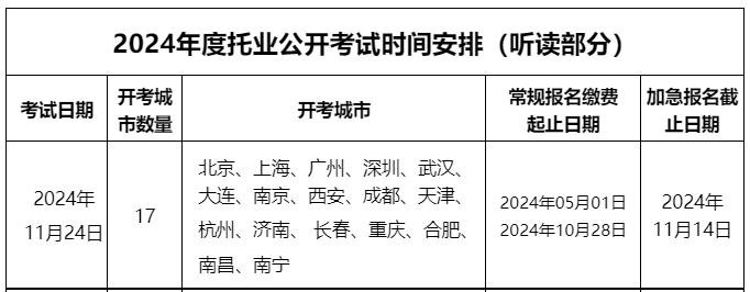 從ETS托業(yè)網(wǎng)發(fā)布的《2024年度托業(yè)公開考試時間安排(聽讀部分)》得知,2024年11月托業(yè)聽力閱讀考試費用、繳費時間及入口已公布,11月14日截止報名繳費,具體詳情如下:
