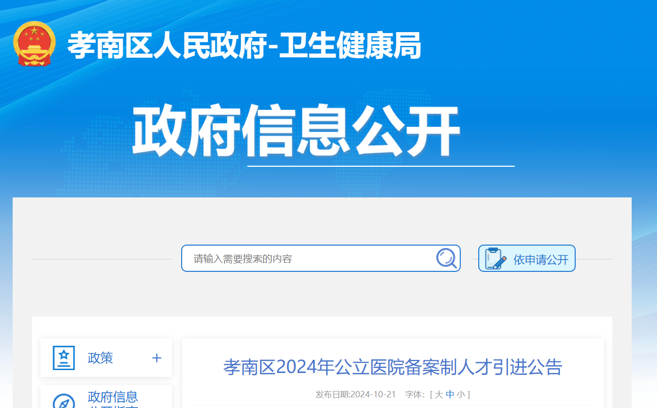 2024年湖北孝感孝南區(qū)公立醫(yī)院備案制人才引進公告已發(fā)布,網(wǎng)上報名時間:2024年10月24日9:00至10月28日17:00,現(xiàn)將招聘公告原文發(fā)布如下: