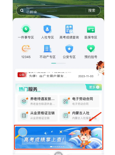 打開“內(nèi)蒙古政務(wù)服務(wù)網(wǎng)”,在首頁找到“高考成績查詢”,點(diǎn)擊進(jìn)入即可查詢高考成績。