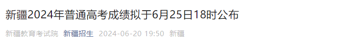 從新疆招生了解到,新疆2024年普通高考成績(jī)擬于6月25日18時(shí)公布,相關(guān)事宜詳情如下: