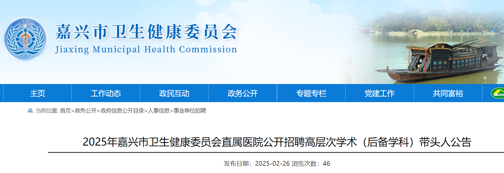 2025年浙江嘉興市衛(wèi)生健康委員會(huì)直屬醫(yī)院公開招聘高層次學(xué)術(shù)(后備學(xué)科)帶頭人公告已發(fā)布,報(bào)名時(shí)間:自公告發(fā)布之日起至2025年11月30日17:00止?,F(xiàn)將招聘公告原文發(fā)布如下: