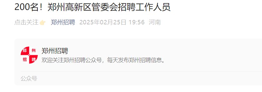 小編根據(jù)鄭州招聘發(fā)布“200名!鄭州高新區(qū)管委會招聘工作人員”得知,2025年河南鄭州高新區(qū)管委會招聘200人,報名時間3月5日-7日。