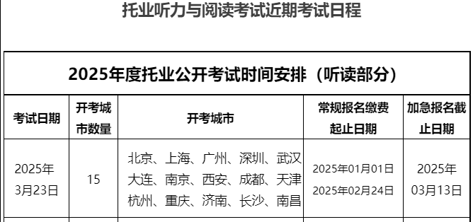 從ETS托業(yè)網(wǎng)發(fā)布的《2025年度托業(yè)公開考試時間安排(聽讀部分)》得知,2025年3月托業(yè)聽力閱讀考試時間、方式、題型及開考城市已公布,3月23日舉行考試,具體詳情如下: