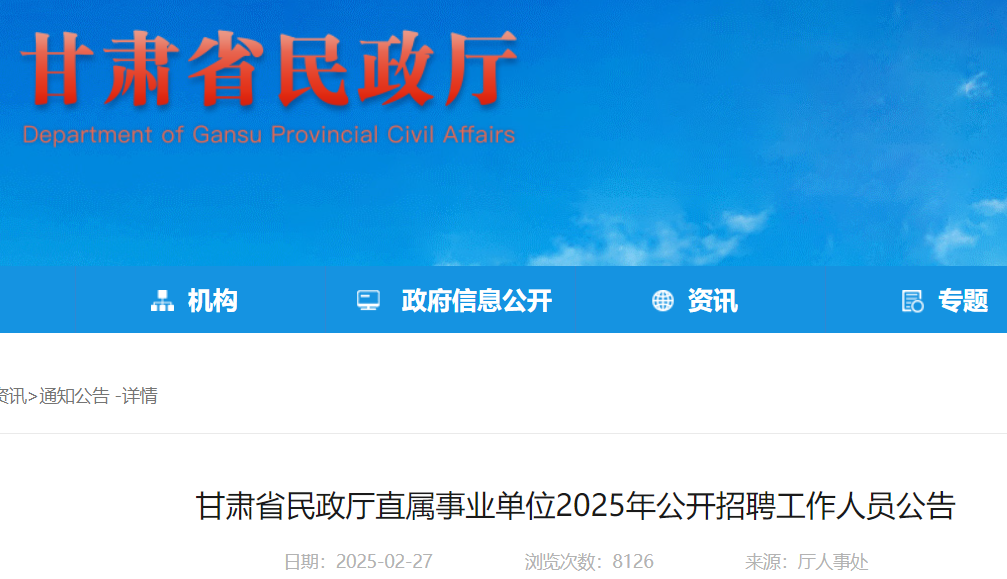 小編根據(jù)甘肅省民政廳發(fā)布”甘肅省民政廳直屬事業(yè)單位2025年公開招聘工作人員公告“得知,2025年甘肅省民政廳直屬事業(yè)單位招聘報名時間3月1日至3月7日,考試時間4月26日。