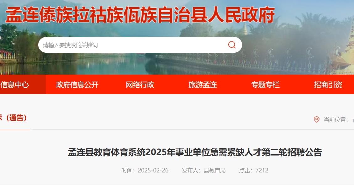 小編根據(jù)孟連縣人民政府發(fā)布”孟連縣教育體育系統(tǒng)2025年事業(yè)單位急需緊缺人才第二輪招聘公告“得知,2025云南普洱市孟連縣教育體育系統(tǒng)事業(yè)單位急需緊缺人才第二輪招聘8人,報(bào)名時(shí)間2月27日至3月5日。