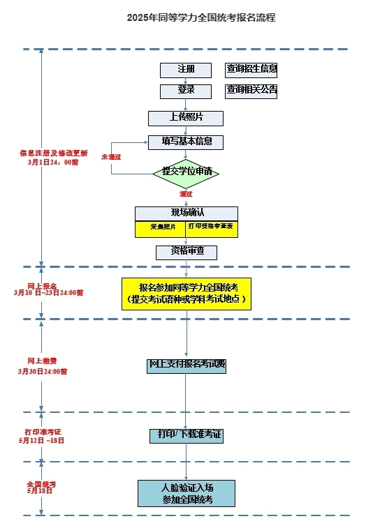 (一)注冊(cè)及在冊(cè)信息修改。擬參加2025年同等學(xué)力全國統(tǒng)考的考生,需于3月1日24:00前在信息平臺(tái)完成注冊(cè)、信息采集(電子照片等)及在冊(cè)信息更新,逾期不可重新注冊(cè)及修改。2025年同等學(xué)力全國統(tǒng)考報(bào)名流程見附件。考生務(wù)必確保信息平臺(tái)與中國教育考試網(wǎng)個(gè)人信息(如姓名、證件類型、證件號(hào)、手機(jī)號(hào)等)完全一致,信息不一致考生無法在中國教育考試網(wǎng)完成報(bào)名;手機(jī)短信為考生接收?qǐng)?bào)名相關(guān)信息的重要途徑,請(qǐng)務(wù)必填寫能夠準(zhǔn)確聯(lián)系到考生本人的手機(jī)號(hào)碼。