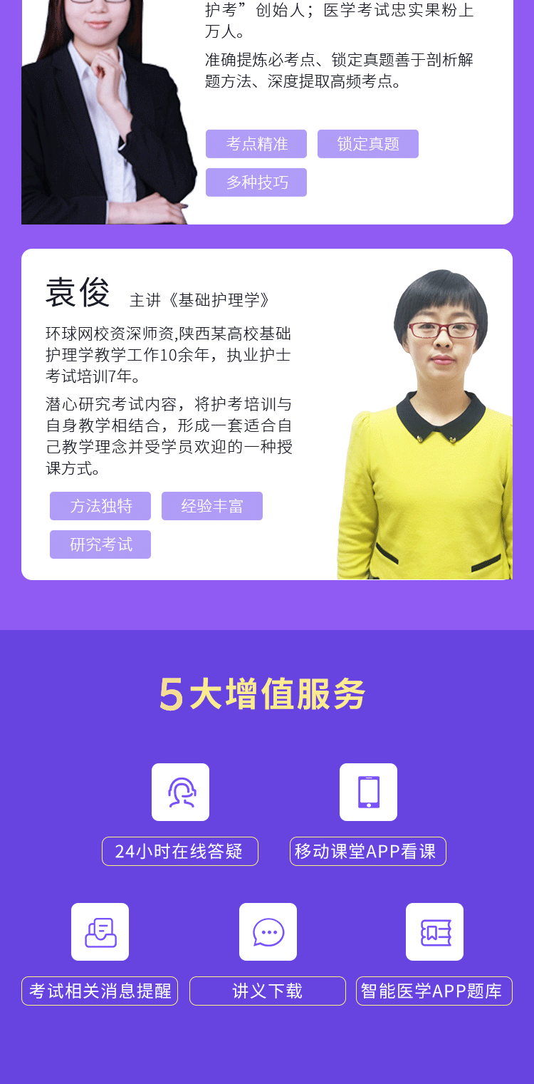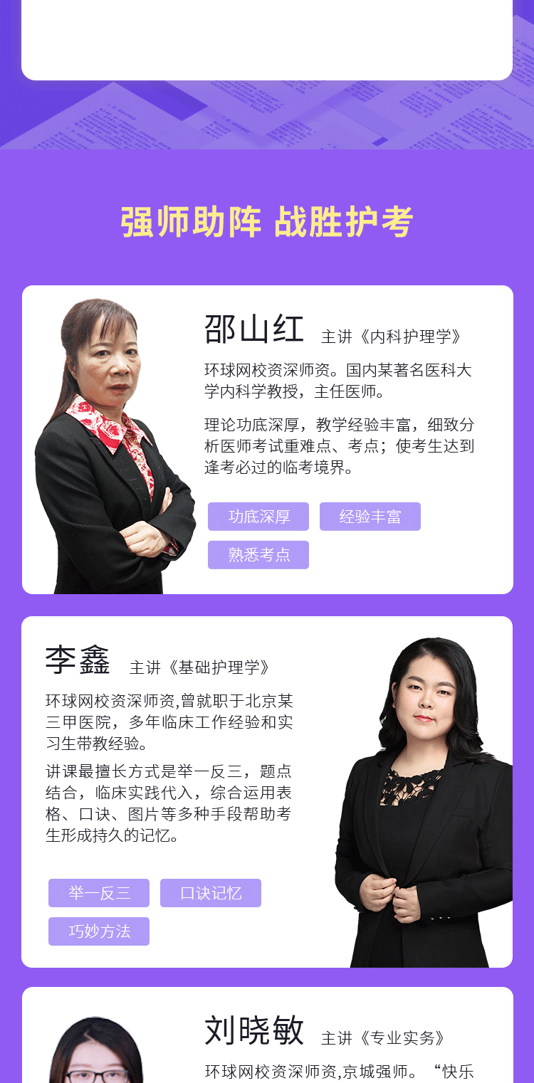 環(huán)球網(wǎng)校資深師資,從事執(zhí)業(yè)護士等考試的培訓(xùn)10余年。講課風(fēng)格通俗易懂,善于在講解知識點的同時直擊考點,讓課堂講解與考試無縫對接。通過記憶口訣讓學(xué)生在短時間內(nèi)理解并掌握主要考點。講課語言幽默風(fēng)趣,善于捕捉學(xué)生心理,常用網(wǎng)絡(luò)熱頻詞匯搞活課堂氣氛,讓學(xué)生對知識點印象深刻。