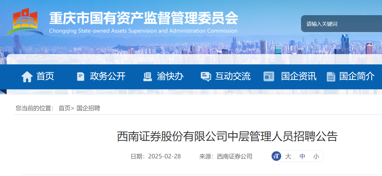 2025年重慶市西南證券股份有限公司中層管理人員招聘公告已發(fā)布,報名截止日期:2025年3月13日,現(xiàn)將招聘公告原文發(fā)布如下: