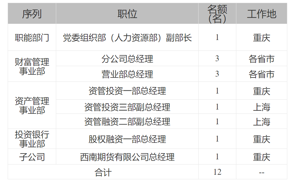 (二)中干正職崗位招聘條件——一類分公司總經(jīng)理、資管投資一部總經(jīng)理、股權融資一部總經(jīng)理、西南期貨有限公司總經(jīng)理