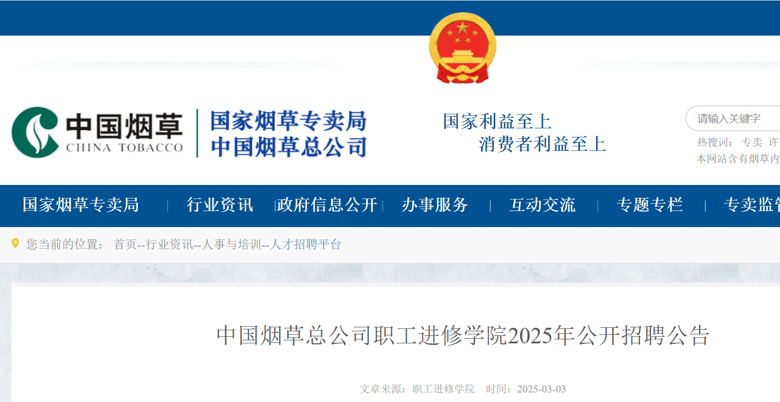 2025年中國煙草總公司職工進(jìn)修學(xué)院公開招聘公告已發(fā)布,報名時間截至3月30日24:00。現(xiàn)將招聘公告原文發(fā)布如下: