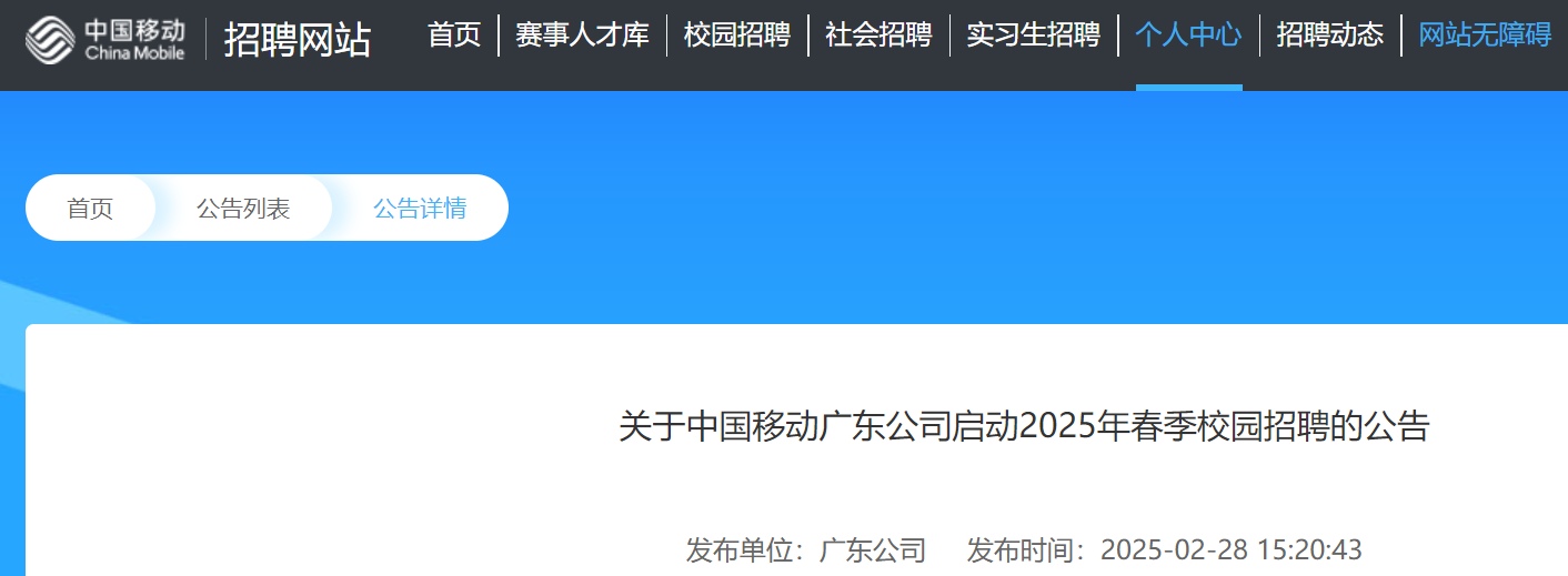 2025年春季中國移動(dòng)廣東公司校園招聘公告已發(fā)布,現(xiàn)將招聘公告原文發(fā)布如下:
