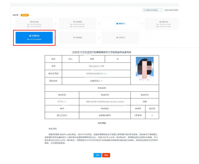 準(zhǔn)考證打印時(shí)間:3月26日9:00開始至考前。報(bào)考學(xué)位外語(yǔ)考試的考生可在安徽繼續(xù)教育在線平臺(tái)(www.ahjxjy.cn)自行打印準(zhǔn)考證,賬號(hào)為考生身份證號(hào)碼,默認(rèn)密碼為身份證號(hào)碼后6位。