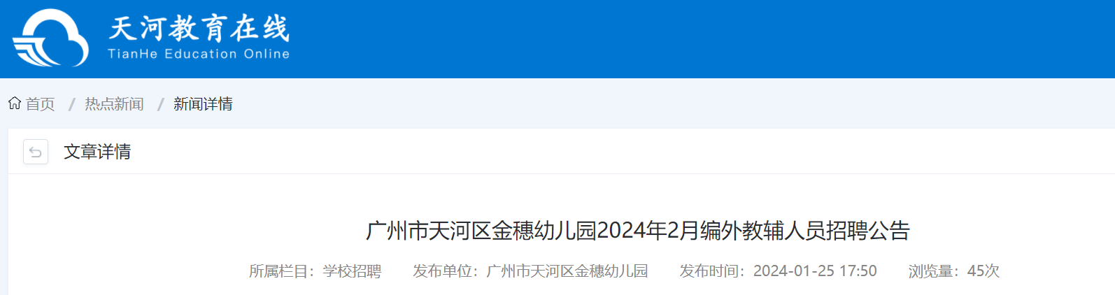 2024年2月廣東廣州市天河區(qū)金穗幼兒園編外教輔人員招聘公告已發(fā)布,網(wǎng)上報名時間:2024年1月25日至2024年2月17日?,F(xiàn)將招聘公告原文發(fā)布如下: