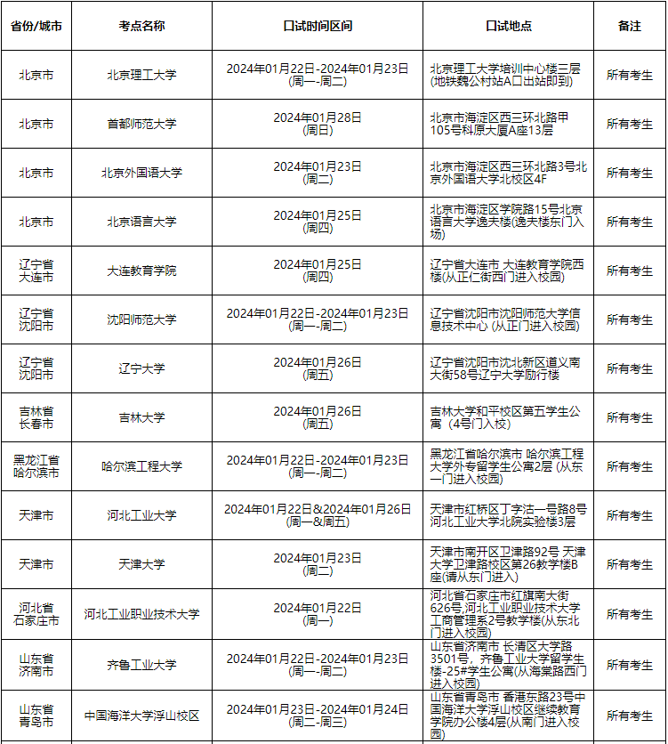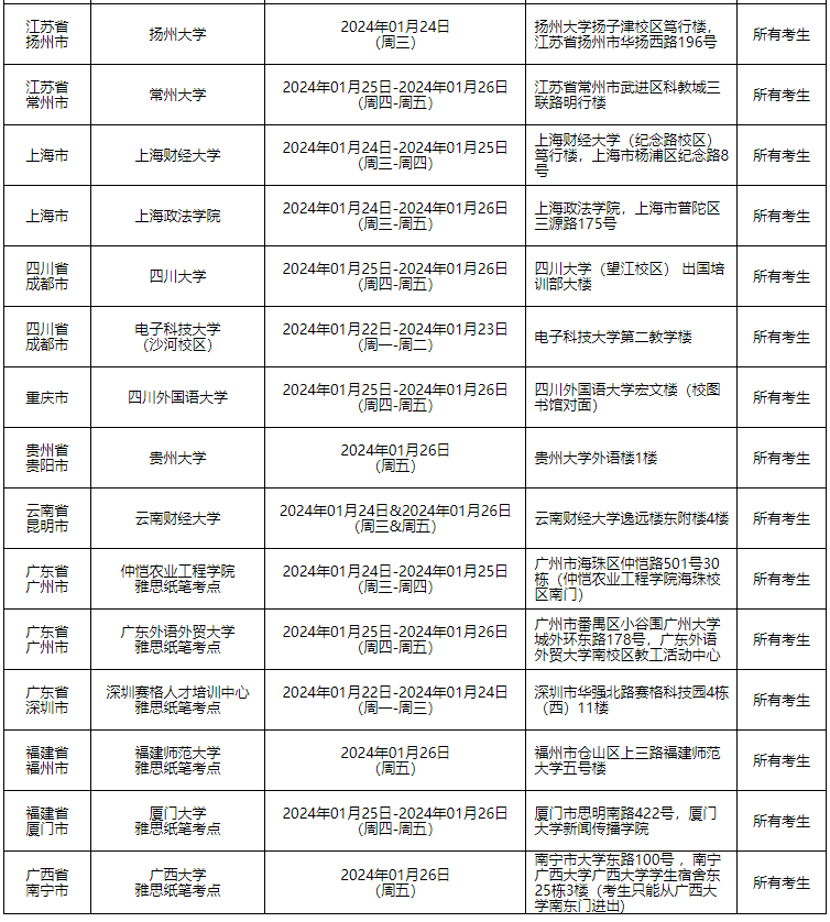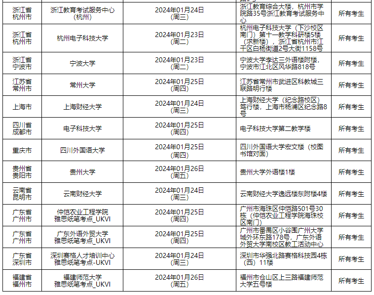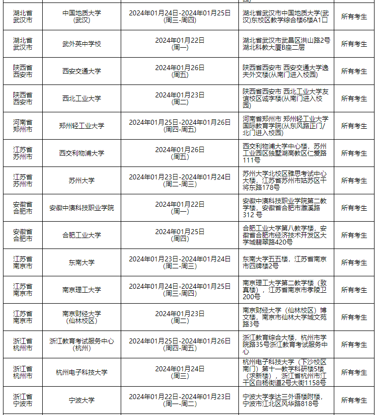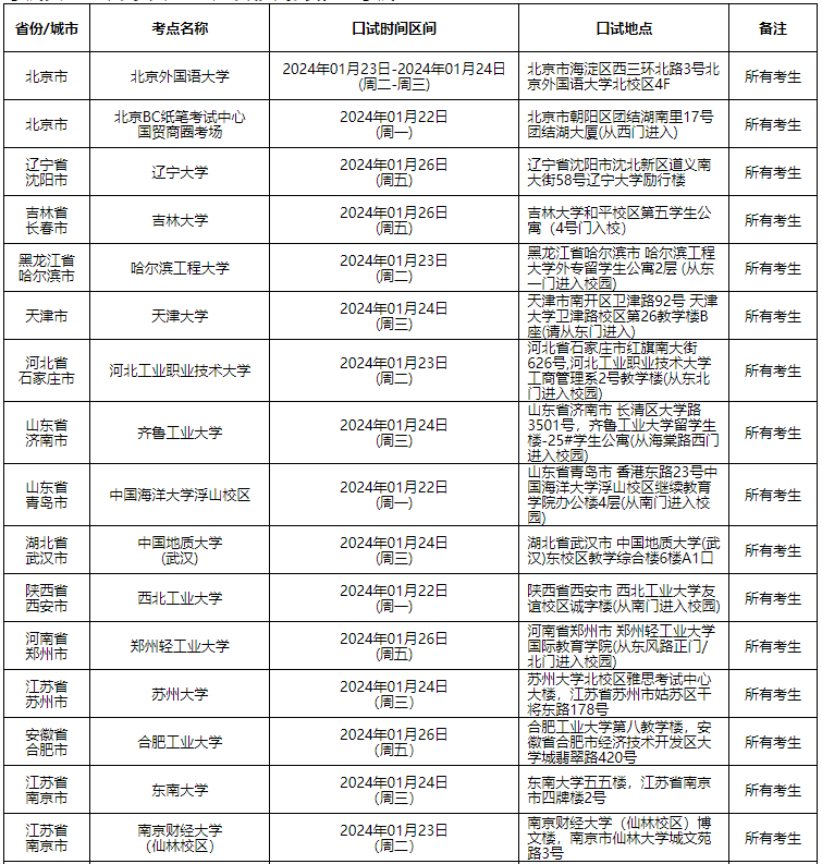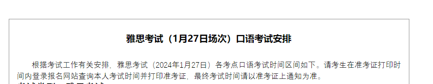 根據(jù)考試工作有關(guān)安排,雅思考試(2024年1月27日)各考點(diǎn)口語考試時(shí)間區(qū)間如下。請考生在準(zhǔn)考證打印時(shí)間內(nèi)登錄報(bào)名網(wǎng)站查詢本人考試時(shí)間并打印準(zhǔn)考證,最終考試時(shí)間請以準(zhǔn)考證上通知為準(zhǔn)。