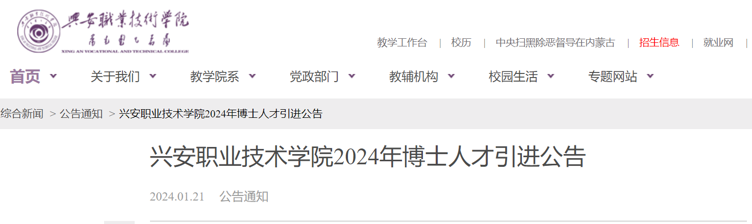 2024內蒙古興安職業(yè)技術學院博士人才引進公告已發(fā)布,本引進公告公布的崗位全年招聘,隨時接收申請?,F將招聘公告原文發(fā)布如下: