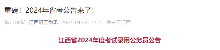 從江西組工微訊發(fā)布的《2024年江西省考試錄用公務(wù)員公告》中獲悉,2024年江西公務(wù)員報(bào)名時(shí)間:2024年1月28日9:00至2月2日17:00,具體安排詳情如下: