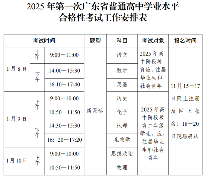 根據(jù)廣東省教育考試院公布的《2025年第廣東普通高中學業(yè)水平合格性考試報名的通知》了解到,廣東河源2025年第普通高中學業(yè)水平合格性考試時間已公布,安排在1月8日至10日期間舉行。具體如下: