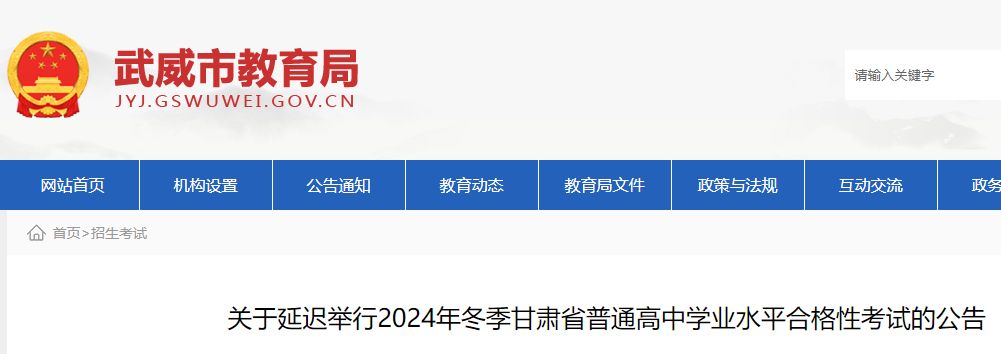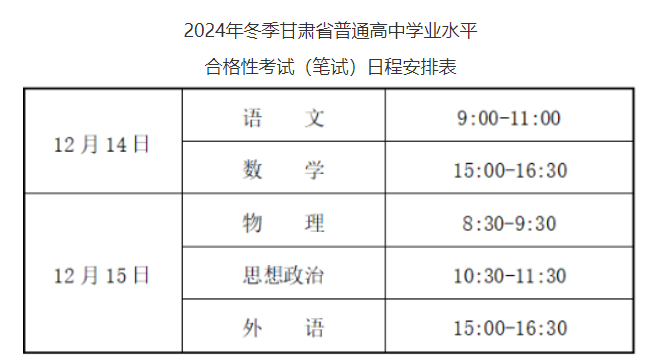 從武威市教育局了解到,2024年冬季甘肅普通高中學(xué)業(yè)水平合格性考試延遲舉行的公告已公布,(筆試)延遲至2024年12月14日-15日舉行。具體如下:
