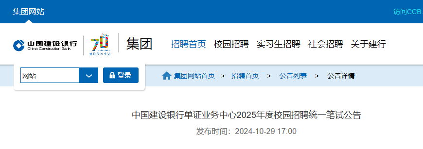 2025年度中國建設(shè)銀行單證業(yè)務(wù)中心校園招聘統(tǒng)一筆試公告已發(fā)布,筆試時間:2024年11月10日14:30-17:00?,F(xiàn)將公告原文發(fā)布如下: