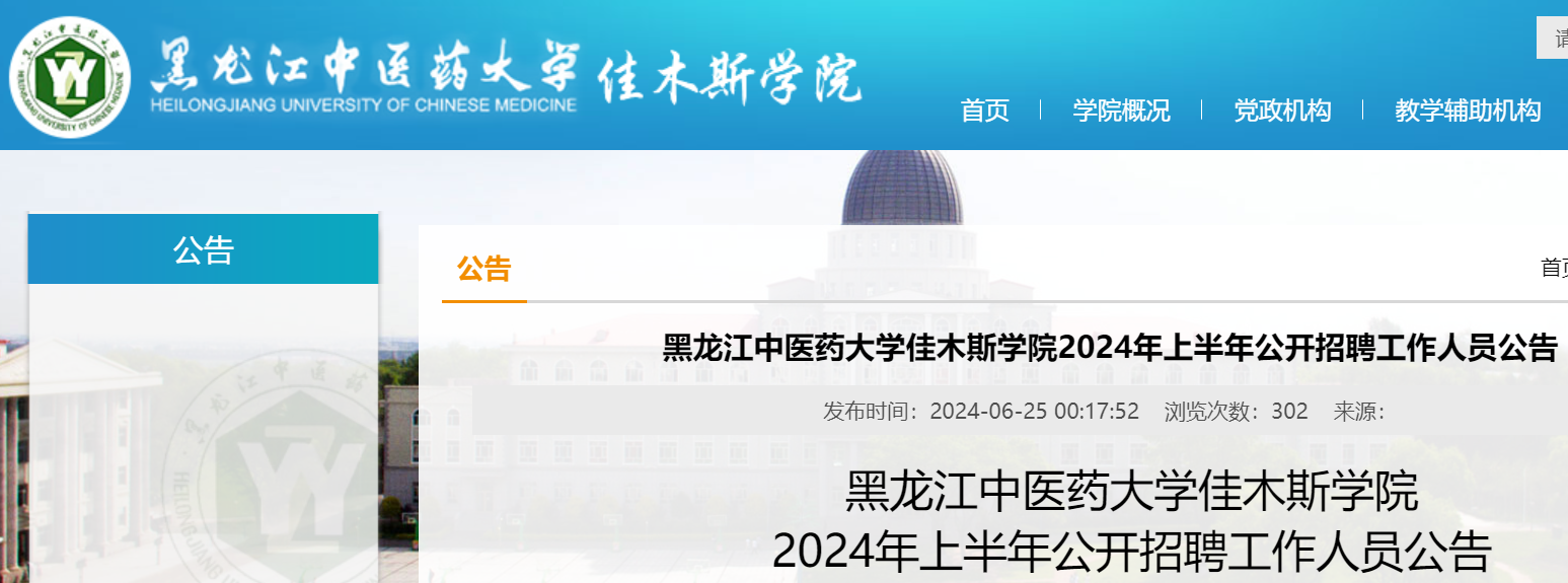 2024年上半年黑龍江中醫(yī)藥大學佳木斯學院公開招聘工作人員公告已發(fā)布,報名時間:2024年6月26日9時-2024年7月9日12時。現(xiàn)將招聘公告原文發(fā)布如下: