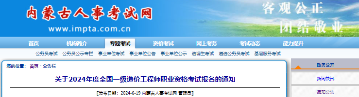 從內(nèi)蒙古人事考試網(wǎng)獲悉,2024年內(nèi)蒙古一級造價(jià)工程師報(bào)考工作現(xiàn)已開始,報(bào)名時(shí)間:6月26日-7月10日,考試時(shí)間:10月19日-20日,更多事宜請參考閱讀《考務(wù)通知》,官方公告原文如下: