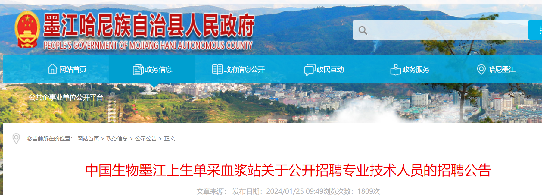 2024中國生物墨江上生單采血漿站公開招聘專業(yè)技術(shù)人員公告已發(fā)布,報名時間:2024年1月25日—2024年2月29日。現(xiàn)將招聘公告原文發(fā)布如下: