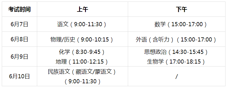(三)考試時間??荚嚂r間安排在6月7日至10日。語文科目考試時長為150分鐘,數(shù)學(xué)和外語(含聽力)科目考試時長均為120分鐘,外語聽力考試(30分鐘)安排在外語筆試考試開始前進(jìn)行。選擇性考試科目考試時長均為75分鐘。考生3門統(tǒng)一高考科目和3門選擇性考試科目全部使用國家通用語言文字答卷。報考少數(shù)民族語言授課專業(yè)的考生還須參加相應(yīng)民族語文科目全省統(tǒng)一考試,考試時長為150分鐘。具體時間安排如下:
