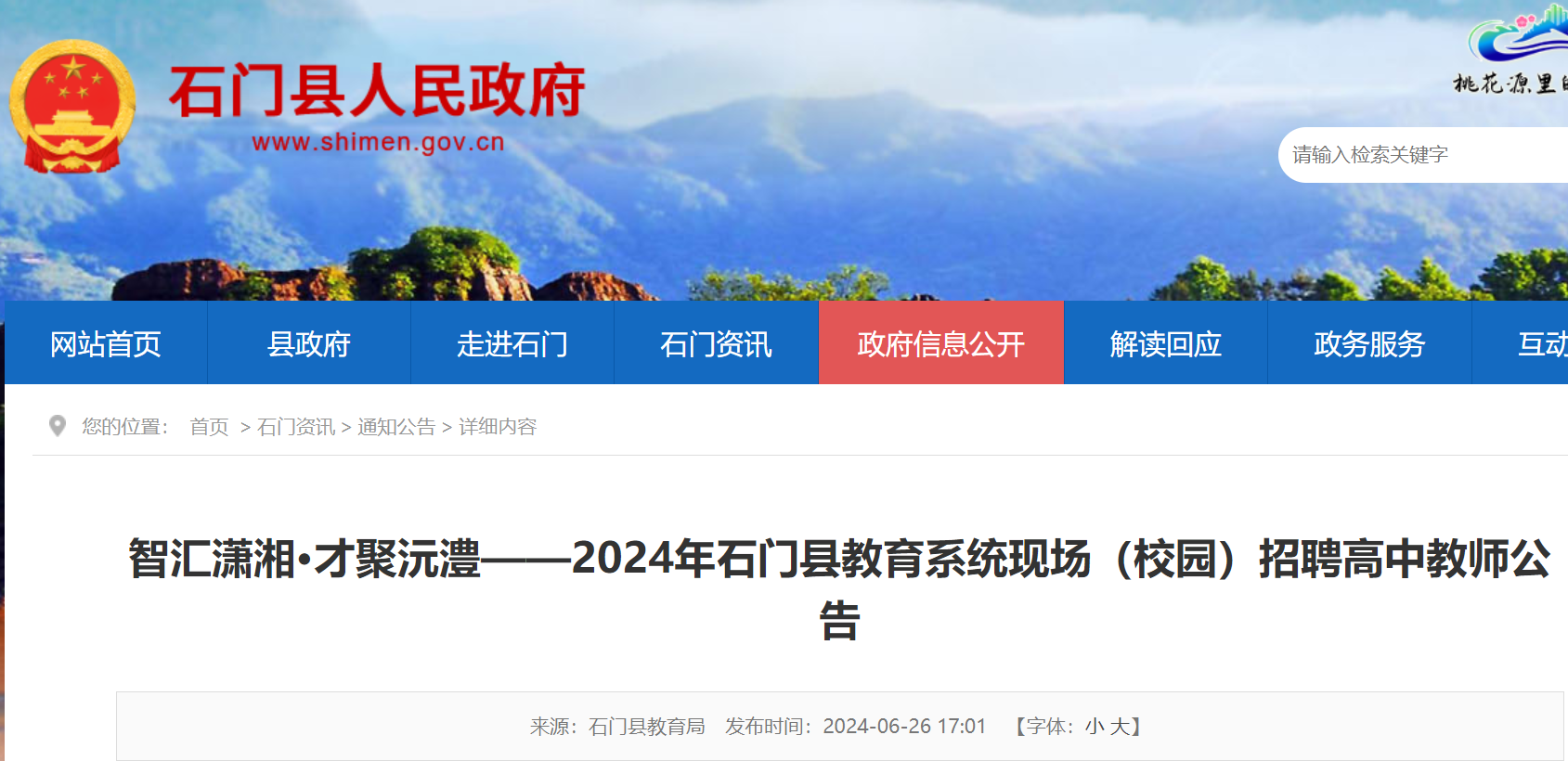 2024年湖南常德石門(mén)縣教育系統(tǒng)現(xiàn)場(chǎng)(校園)招聘高中教師公告已發(fā)布,網(wǎng)上報(bào)名時(shí)間:2024年7月6日8:00-7月7日17:00?,F(xiàn)將招聘公告原文發(fā)布如下: