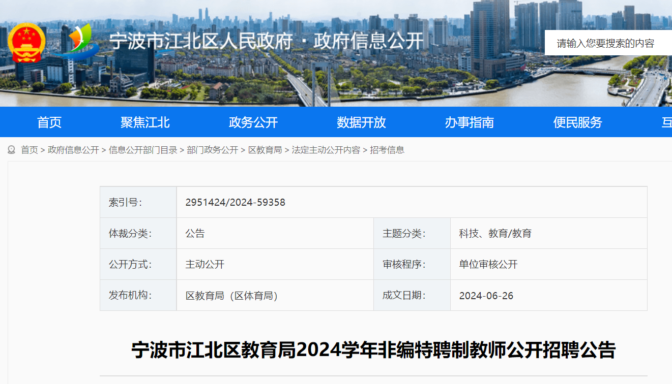 2024學年浙江寧波市江北區(qū)教育局非編特聘制教師招聘公告已發(fā)布,報名時間:2024年6月26日至7月4日?,F(xiàn)將招聘公告原文發(fā)布如下: