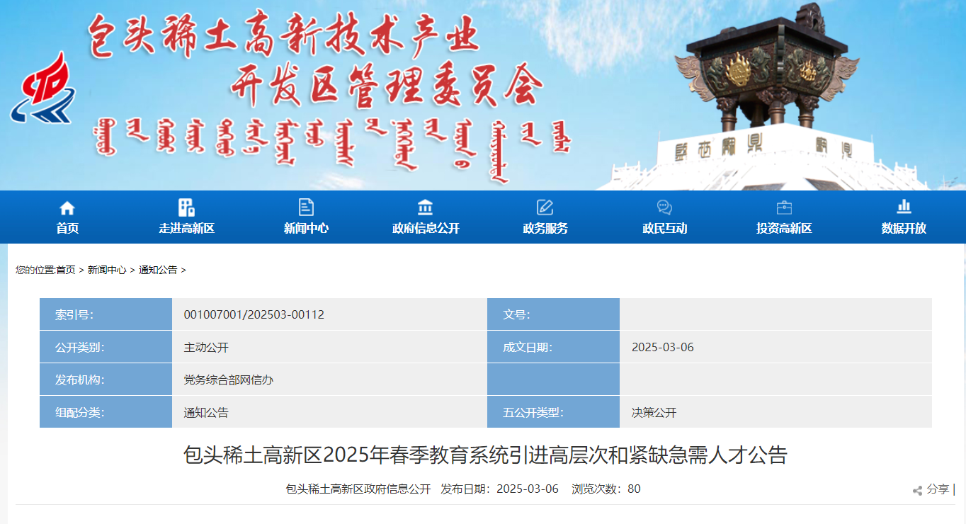 根據(jù)包頭稀土高新區(qū)教育系統(tǒng)用人需求,決定面向社會(huì)公開引進(jìn)一批高層次和緊缺急需人才?,F(xiàn)將有關(guān)事宜公告如下:一、引進(jìn)數(shù)量及崗位
