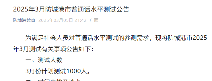 為滿足社會(huì)人員對(duì)普通話水平測(cè)試的參測(cè)需求,現(xiàn)將防城港市2025年3月測(cè)試有關(guān)事項(xiàng)公告如下: