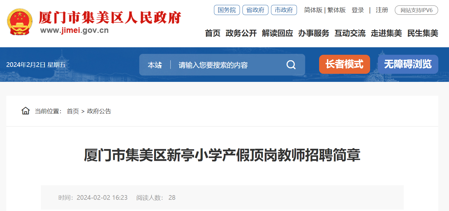 2024福建廈門市集美區(qū)新亭小學(xué)產(chǎn)假頂崗教師招聘簡章已發(fā)布,報名時間:2024年2月2日至3月1日?,F(xiàn)將招聘公告原文發(fā)布如下: